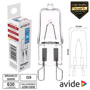 – Lâmpada Halogéneo G9– Tipo de Casquilho: G9– Tensão funcionamento: 230VAC– Potência: 42W=56W, Branco Quente– Temperatura cor: 3000K, 630 Lumens– Ângulo luminoso: 360º