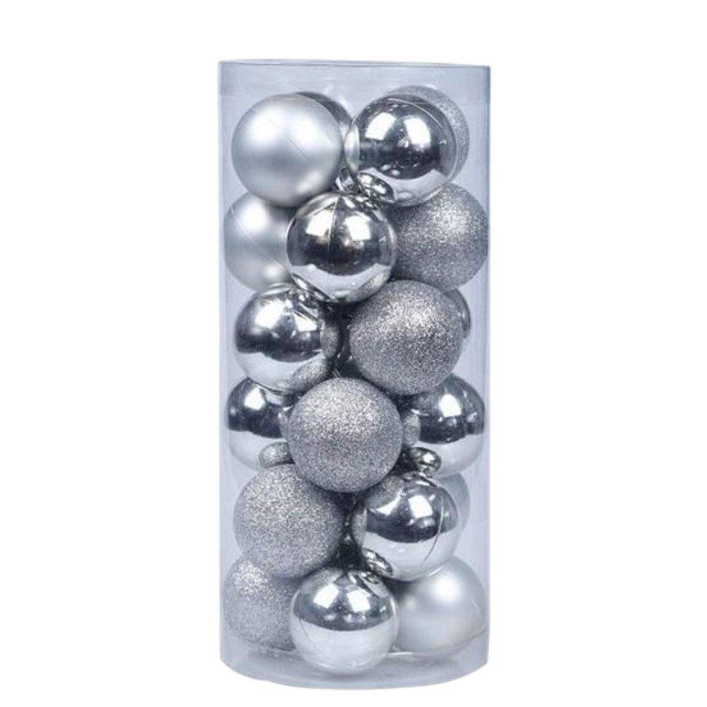 – Conjunto de 24 bolas de natal– Conjunto composto por Bolas de superfície texturizadalisa e espelhada– Cor: Prateado– Caixa Cilindrica– Diâmetro: 80mm