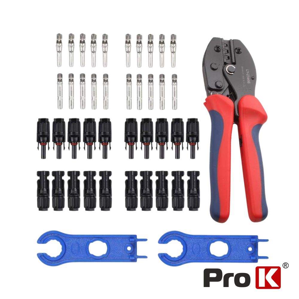 – 1 Alicare de cravar fichas solares– 2 Chaves de montagem– 12 Fichas Fotovoltaicas MC4 (6 macho e 6 fêmeas)– Adequado p/ cabos: 2.5-6.0mm²
