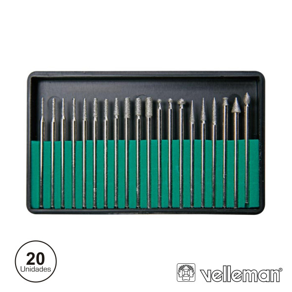 – Conjunto de 20 pontas fresa p/ Berbequim– 20 Pontas fresa em Diamante, formas diferentes– Diâmetro do eixo: Ø3mm– Comprimento máximo: 45mm