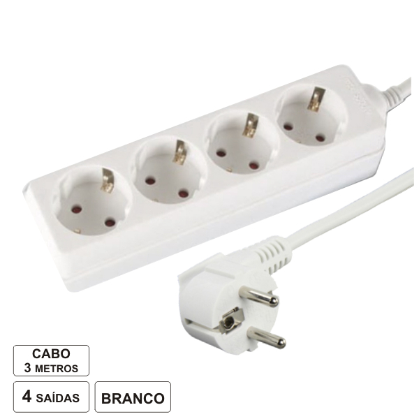 – Tomada eléctrica c/ 4 saídas– Tensão funcionamento: 220-250Vac– Potência: 3680W, Corrente: 16A-14A– Comprimento do cabo: 3m, Secção: 3×1.5mm²– Cor da tomada: Branca