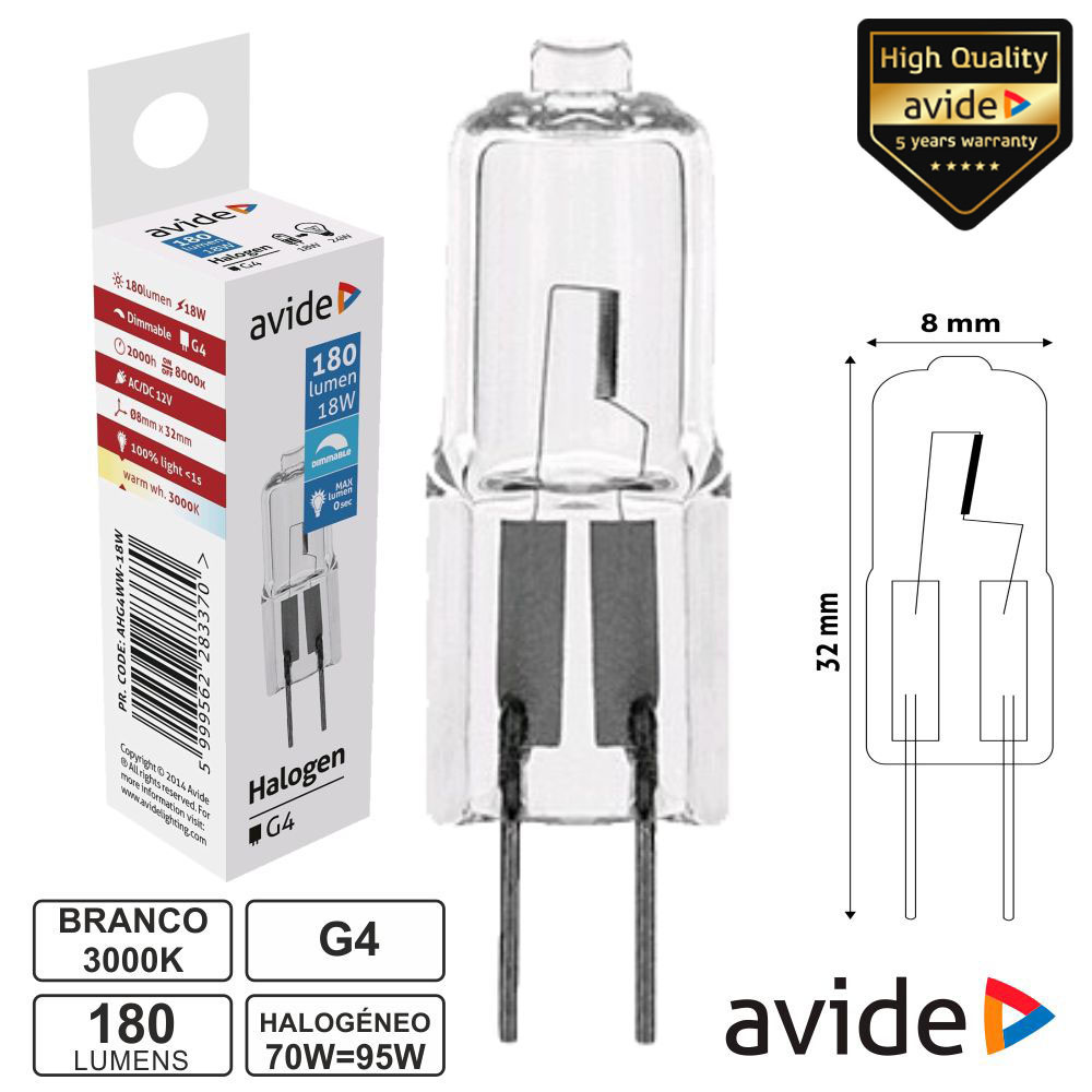– Lâmpada Halogéneo G4– Tipo de Casquilho: G4– Tensão funcionamento: 12VDC– Potência: 70W=95W, Branco Quente– Temperatura cor: 3000K, 180 Lumens– Ângulo luminoso: 360º