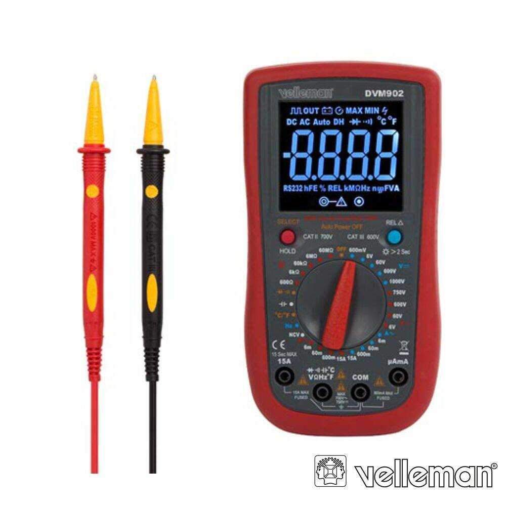 – Indicador de bateria fraca, cabos de teste (incl.)
