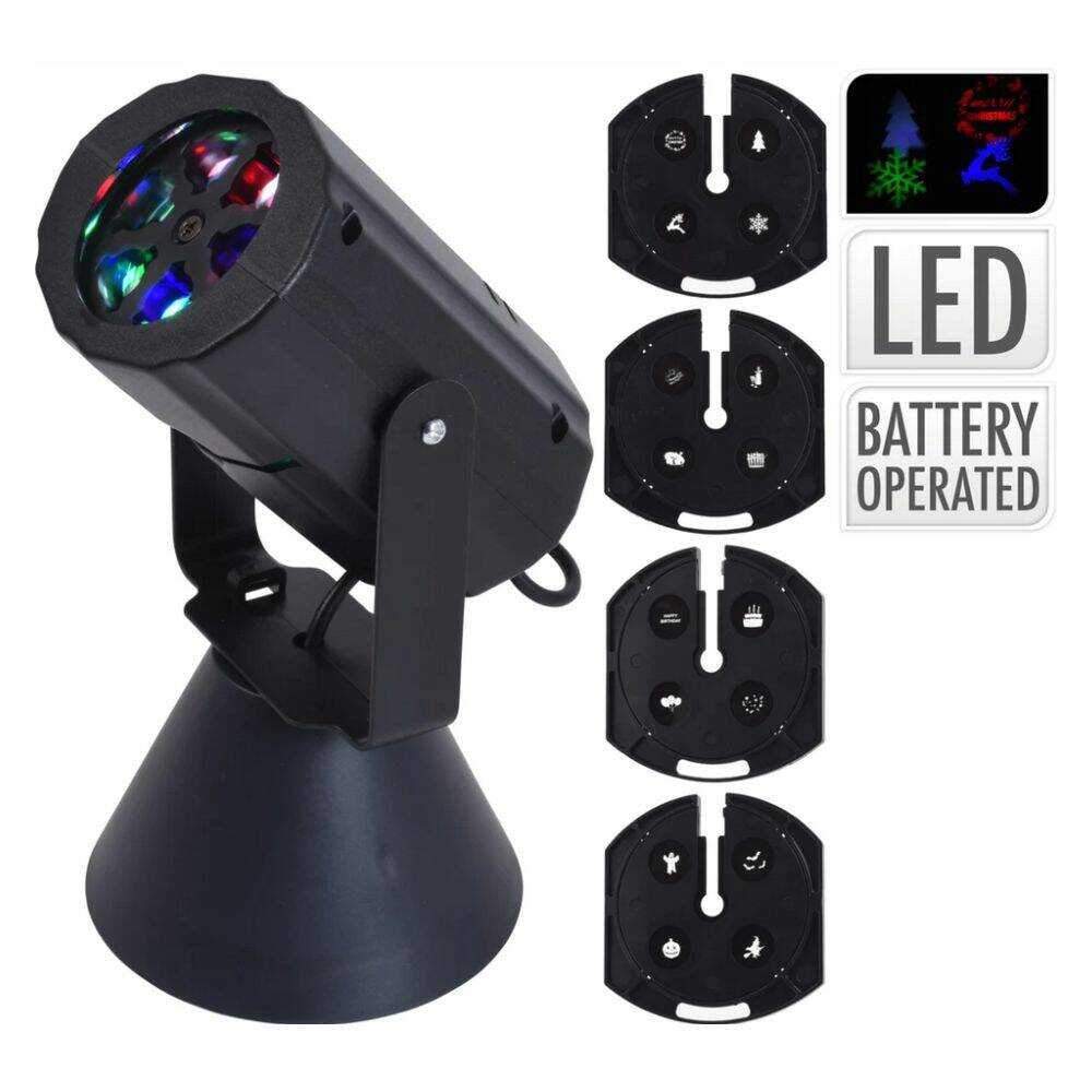 – Projetor LED p/ interior– 4 Slides internos p/ efeitos luminosos– Slides: Halloween, Aniversário, Ano novo, Natal– Alcance: 9m, 20mp– Alimentação: 3x AA (não incl.)